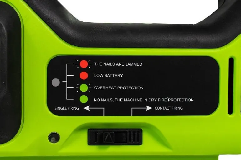 Gwoździarka Greenworks GD24BN to profesjonalne narzędzie do wbijania sztyftów o długości maksymalnej 50 mm. W prawidlowym osadzeniu całego gwoździa z pomoca idzie płynna regulacja siły wbijania (pokrętło). Narzędzie posiada ciekawą funckcję – mianowicie możliwość wbijania gwoździ seriami. Po wciśnięciu na stale spustu wystarczy odrywać gwoździarkę i przykładać w kolejne miejsce – gwoździarka sama będzie wbijała kolejnego gwoździa (bez puszczania spustu). Zabezpieczenie przed omyłkowym strzałem zapewnia bezpieczeństwo funkcjonowania.