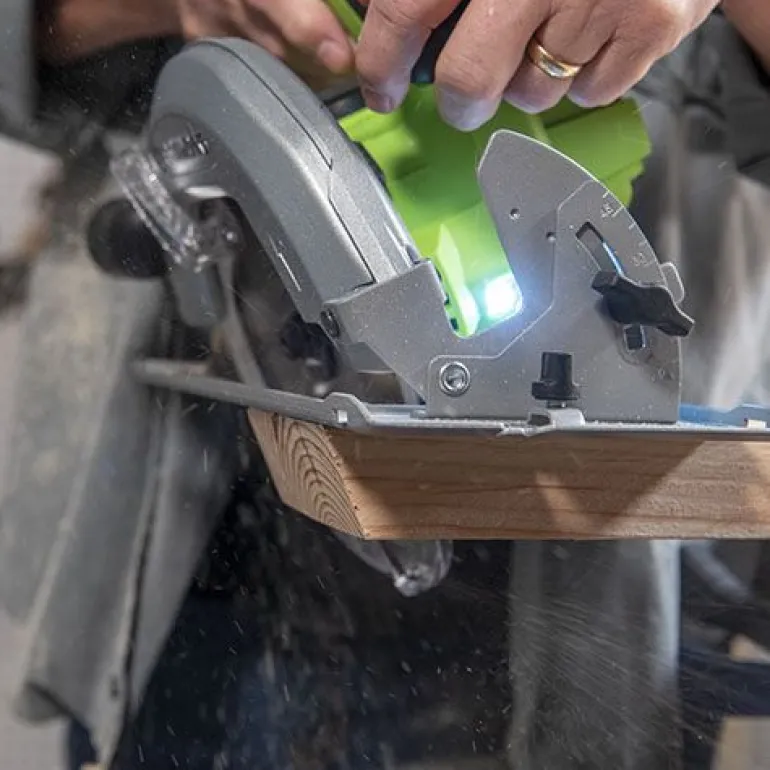 Aby zapewnić precyzyjne i dokładne cięcie, pilarka tarczowa jest wyposażona w laserowy wskaźnik linii cięcia, solidną podstawę prowadzącą i znaczniki wymiarów. Tarcza jest pokryta osłoną ochronną. Rękojeść jest gumowana i ma wygodny ergonomiczny kształt. Regulacja prędkości jest płynna, zapewniony jest system ochrony przed przypadkowym uruchomieniem.