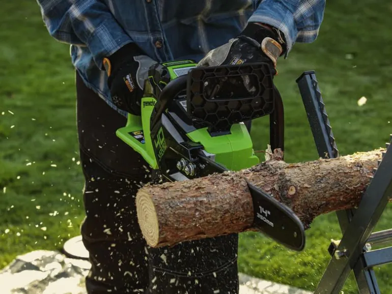 Waga pilarki (bez akumulatora) to zaledwie 3,8 kg, łańcuch ma 3/8”, a prowadnica ma aż 40 cm długości – te cechy umożliwiają niewiarygodnie skuteczną i komfortową pracę. Prędkość suwu łańcucha po prowadnicy to aż 20 m/s – to niekiedy znacznie więcej niż w spalinowych odpowiednikach. Dzięki temu cięcie wykonamy szybciej i precyzyjniej. Urządzenie łatwe w użyciu dzięki miękkiej rękojeści. Napięcie czy wymiana łańcucha nie wymaga stosowania żadnych dodatkowych narzędzi.