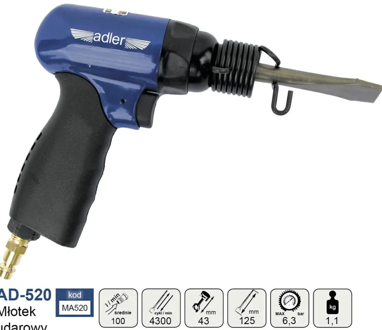 Zalety modelu AD-520 to solidna metalowa obudowa i wygodna gumowana rękojeść. Dużym atutem jest również wysoka liczba uderzeń udaru – (4300 r.p.m.) przy stosunkowo niewielkim zapotrzebowaniu na sprężone powietrze – (100 l/m).