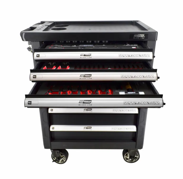4 górne szuflady posiadają wkłady z wyposażeniem, wyłożone wkładkami piankowymi; pozostałe puste.