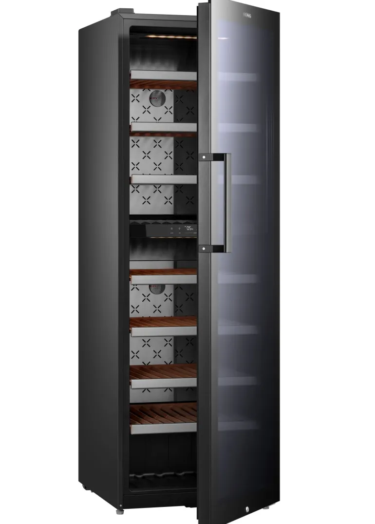WINIARKA BERG BRGWM193D-Winiarka wolnostojąca-Pojemność 193 butelek (liczonych jako Bordeaux)-Pojemność winiarki 430l-5 drewnianych półek-regulacja temperatury 5-18 st. C.-2 strefy,193L, 237L-sterowanie elektroniczne,-elektroniczny wyświetlacz w kolorze białym,-Drzwi szklane pełne 3 warstwy w kolorze czarnym.-Mozliwość przełożenia drzwi-Oświetlenie LED białe, -Głośność 41dB: Klasa C-Wymiary: WxSXG: 1845x595x705 waga 92,5 netto, -klasa G (nowa klasa 2021)