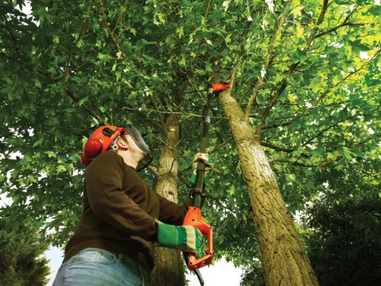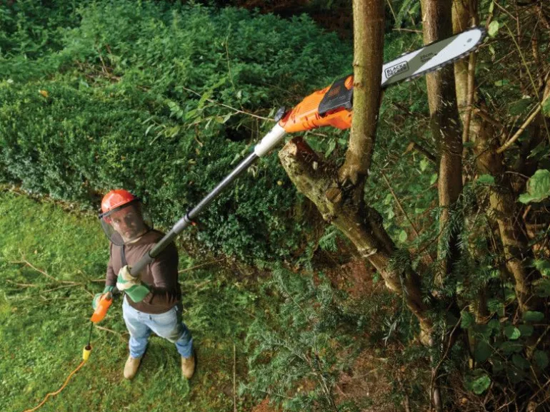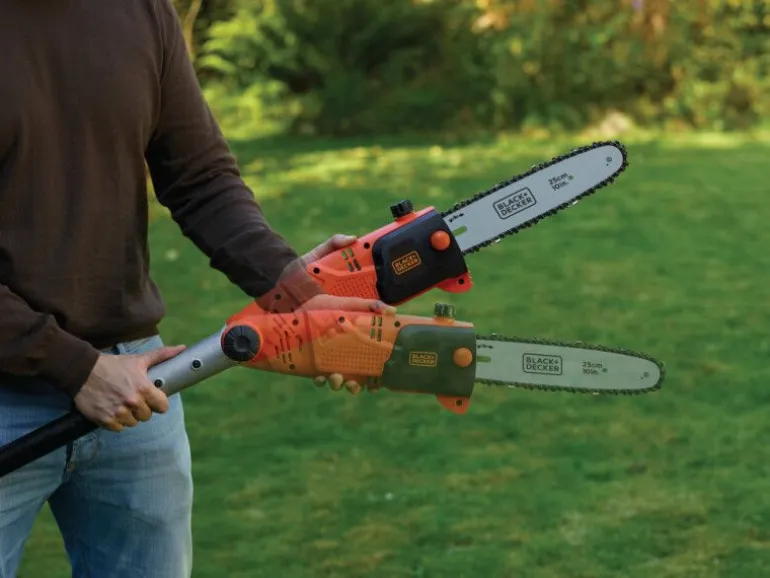 Elektryczna piła łańcuchowa PS7525 firmy Black&Decker, z silnikiem 800W, prowadnicą 25cm na wysięgniku z maksymalną długością 270cm.