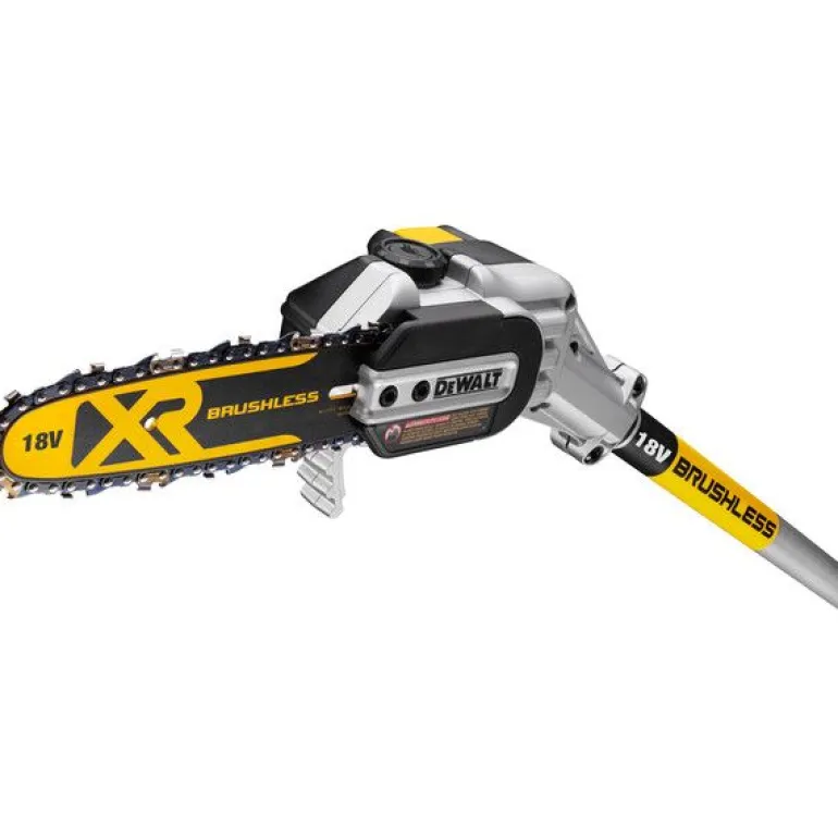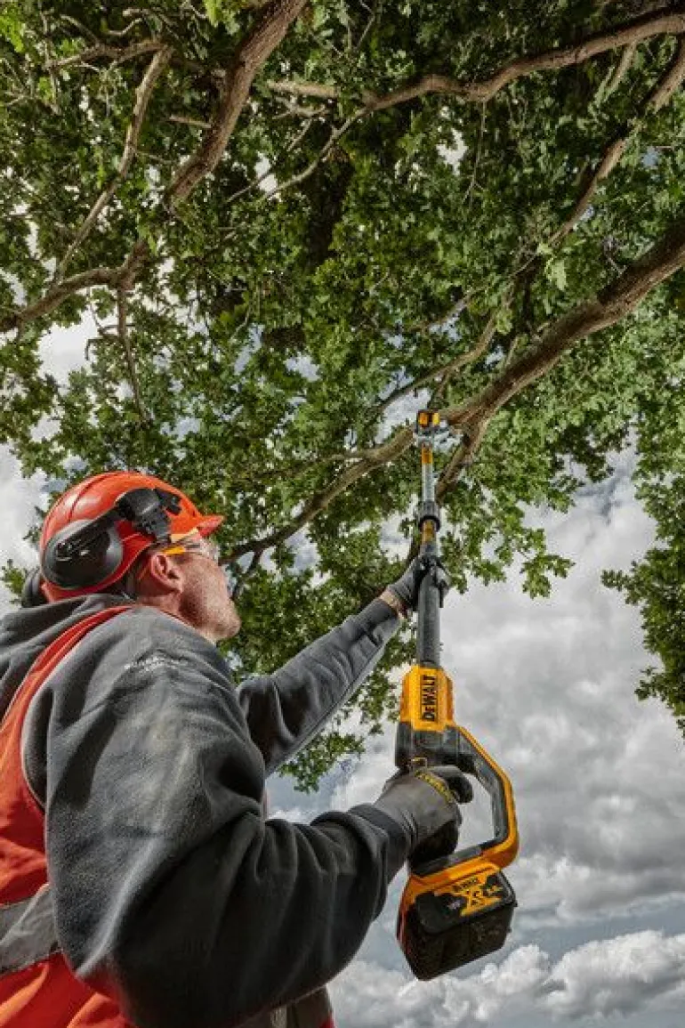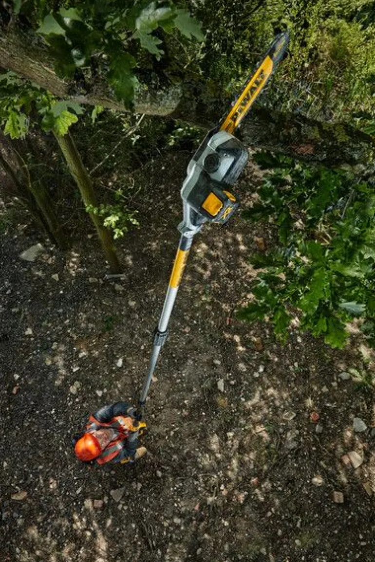 - Pilarka na wysięgniku DEWALT osiąga odległość 4,5 metra*, z zagiętą głowicą, która zapewnia użytkownikom bardziej kontrolowaną pozycję, szczególnie w przypadku trudniejszych prac, takich jak okrzesywanie lub ścinanie.