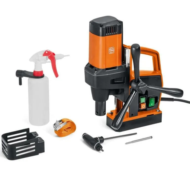 Do pracy w trudnych warunkach dzięki najwyższej jakości wykonania i wewnętrznej prowadnicy przewodu silnika. Bezkompromisowa trwałość dzięki wyjątkowo trwałej konstrukcji przekładni (nawet do 400 godzin pracy). Niewielka masa, mocny silnik FEIN i wysoki moment obrotowy do wszystkich otworów rdzeniowych. Doskonały stosunek ceny do wydajności. Chłodzenie wewnętrzne. Wysoka siła mocowania magnesu. Pokrętło posuwu z możliwością montażu po obu stronach. Dobra dostępność w ciasnych sytuacjach roboczych. Wyłącznik ochronny.