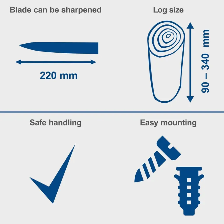 - Nadaje się do kłód o długości od 90 do 340 mm: Narzędzie jest wszechstronne i dostosowane do różnych rozmiarów drewna.