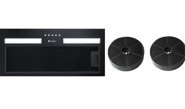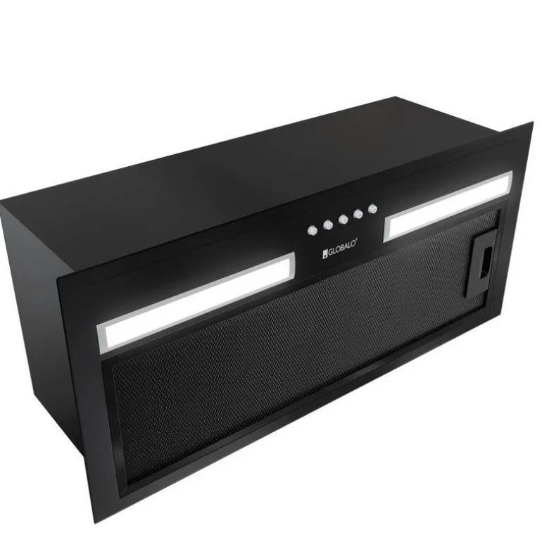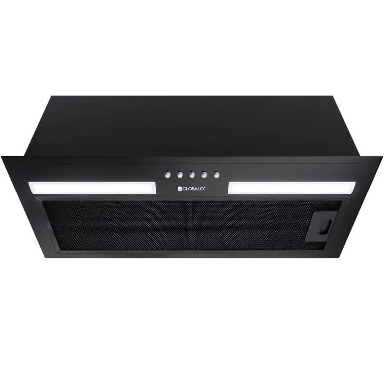 Klasa energetyczna D, do zabudowy, szer 59,6 cm, gł 26,6 cm, sterowanie push-button, zakres prędkości: 3, wydajność max. 320 m 3/h, głośność min. 45 dB, wykonanie: stal lakierowana na kolor czarny, oświetlenie pasmo LED 2 x 6W. Linia GLOBALO Design