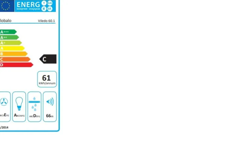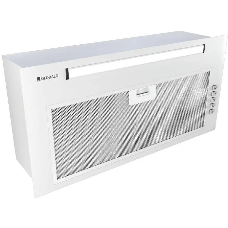 Klasa energetyczna C, do zabudowy, szer 59,8 cm, gł 29 cm, sterowanie push-button, zakres prędkości: 3, wydajność max. 415 m 3/h, głośność min. 49 dB, wykonanie: stal lakierowana na kolor biały, oświetlenie pasmo LED 4W. Linia GLOBALO Design