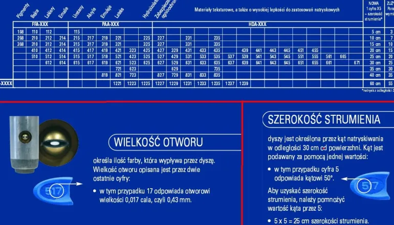 Rodzaj natryskiwanego materiału a zakres otworów dysz:
