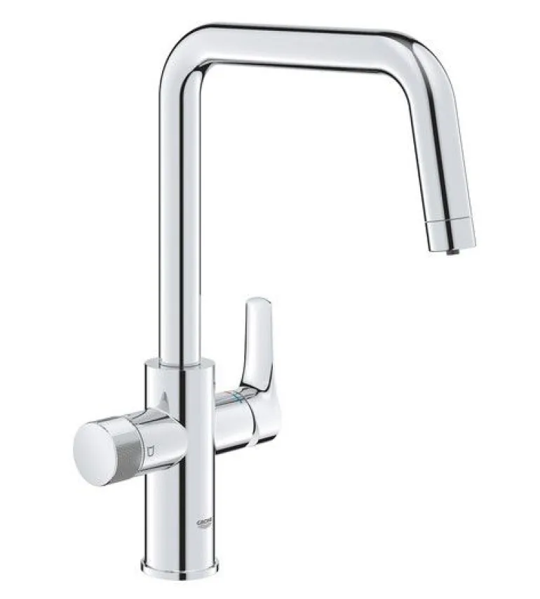 -elementy składowe:-GROHE Blue jednouchwytowa bateria kuchenna z funkcją filtrowania wody-montaż jednootworowy-wylewka U-oddzielne pokrętło dla wody przefiltrowanej-GROHE SilkMove głowica ceramiczna 28 mm-obrotowa wylewka-kąt obrotu 150°-oddzielne kanały dla wody przefiltrowanej i nieprzefiltrowanej-giętkie węże przyłączeniowe-do użytku z zestawem startowym filtrów GROHE Blue (zamawiane osobno)