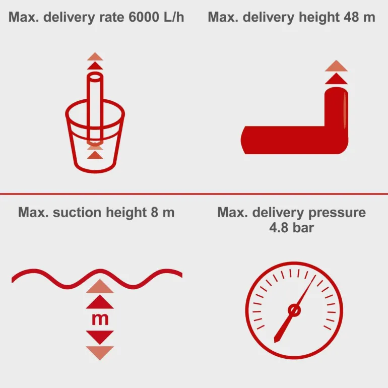- Wysoka Wydajność: Przepływ wody do 6000 L/h pozwala na szybkie i efektywne nawadnianie oraz zaopatrywanie w wodę.