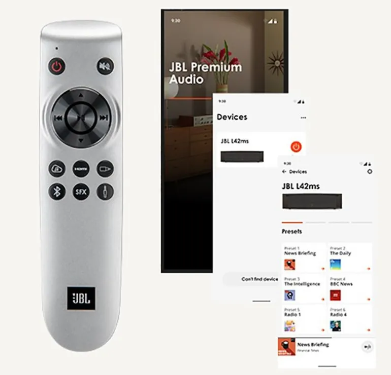 Wszystkie sygnały audio są kierowane przez zaawansowany procesor DSP, gdzie zawartość jest dokładnie przetwarzana i wysyłana do głośników za pośrednictwem czterokanałowego wzmacniacza dostarczającego 75W RMS do każdego woofera i 25W RMS do każdego przetwornika wysokotonowego. Łączna moc wzmacniacza 200 W RMS może być kontrolowana za pomocą panelu dotykowego umieszczonego na górze obudowy, dołączonego pilota Bluetooth, jednej z wielu aplikacji muzycznych lub dedykowanej aplikacji JBL Premium Audio App. Współpraca z SmartThings oraz Roon Ready.