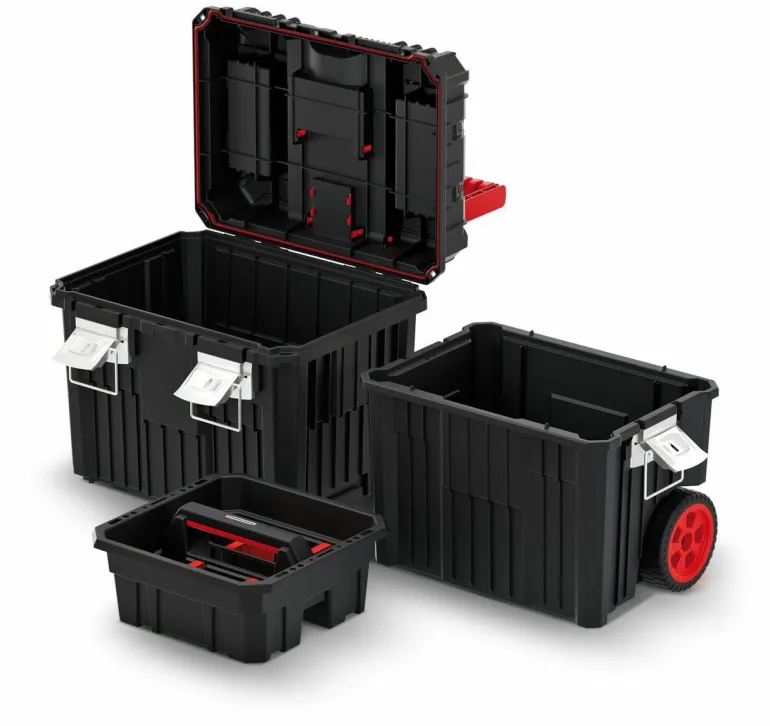 Skrzynia z dużymi kołami ułatwiającymi transport.