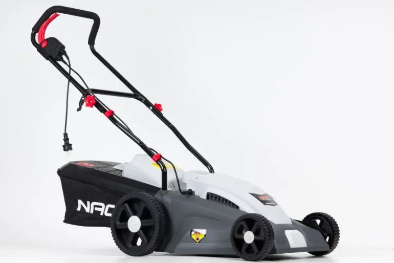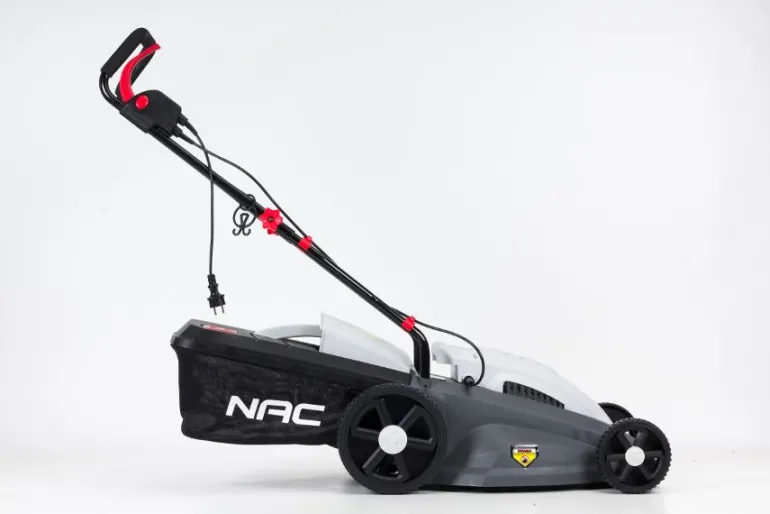 NAC Kosiarka elektryczna LE18-42-PI-JT z silnikiem o mocy znamionowej 1800 W, szerokości koszenia 420 mm oraz wysokości koszenia regulowanej uchwytem centralnym 5-stopniowo w zakresie 25 – 75 mm.