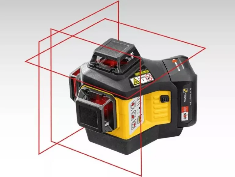 - Zasilany akumulatorem CAS 12 V, samoniwelujący laser wieloliniowy z trzema czerwonymi liniami laserowymi 360° do precyzyjnych prac związanych z rozplanowaniem.