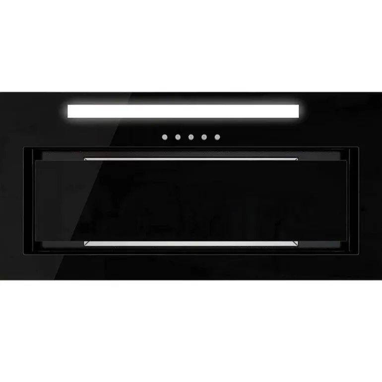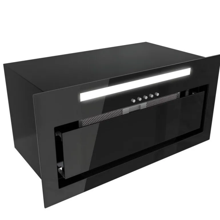 Klasa energetyczna B, do zabudowy, szer 60, gł 29 cm, sterowanie sensorowe (dotykowe) z wyświetlaczem LED, zakres prędkości: 3, wydajność max. 525 m3/h, głośność min. 48 dB, wykonanie: czarne hartowane szkło, stal lakierowana na czarno, oświetlenie pasek LED 5 W, dodatki: