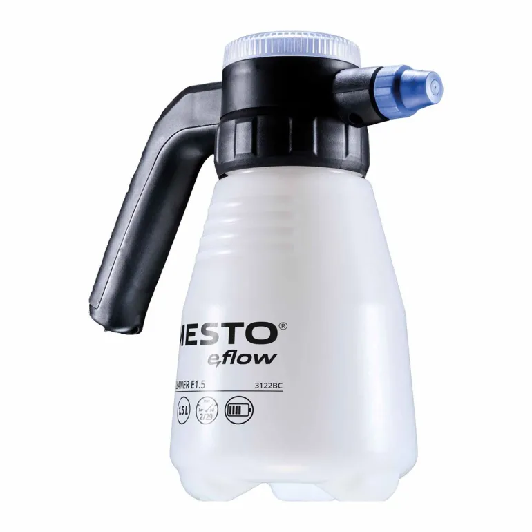 Bezprzewodowy opryskiwacz ciśnieniowy e.CLEANER F1.5 l do stosowania w branży czyszczącej, do dezynfekcji, czyszczenia pojazdów, ochrony antykorozyjnej i impregnacji. Wykonany z tworzywa sztucznego widoczną skalą napełniania. Uszczelki EPDM zapewniają dobrą odporność na wiele środków czyszczących. Dysza regulowana, wykonana z tworzywa sztucznego. Solidne urządzenie o pojemności 1,5 litra jest niezawodnym i trwałym pomocnikiem nawet w przypadku najbardziej agresywnych środków czyszczących. e.CLEANER F1.5 można ładować za pomocą dołączonego kabla USB-C. W pokrywie e.CLEANER F1.5 znajduje się schowek na części zamienne np. do przechowywania kabla. Kolejną cechą produktu jest cyfrowy wskaźnik baterii, który pozwala na stałe monitorowanie stanu baterii.