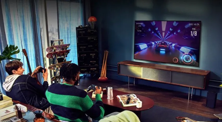 Graj bez ograniczeń i zanurz się w żywych barwach telewizora Xtra! HDMI 2.1, niesamowicie szybka, natywna częstotliwość odświeżania 120 Hz oraz wyjątkowo niski input lag pozwalają wydobyć to, co najlepsze ze sprzętu do gier nowej generacji, zapewniając płynną, dynamiczną rozgrywkę, naturalny ruch i świetnie wyglądającą grafikę. Tryb gry Ambilight zapewnia jeszcze większe emocje.