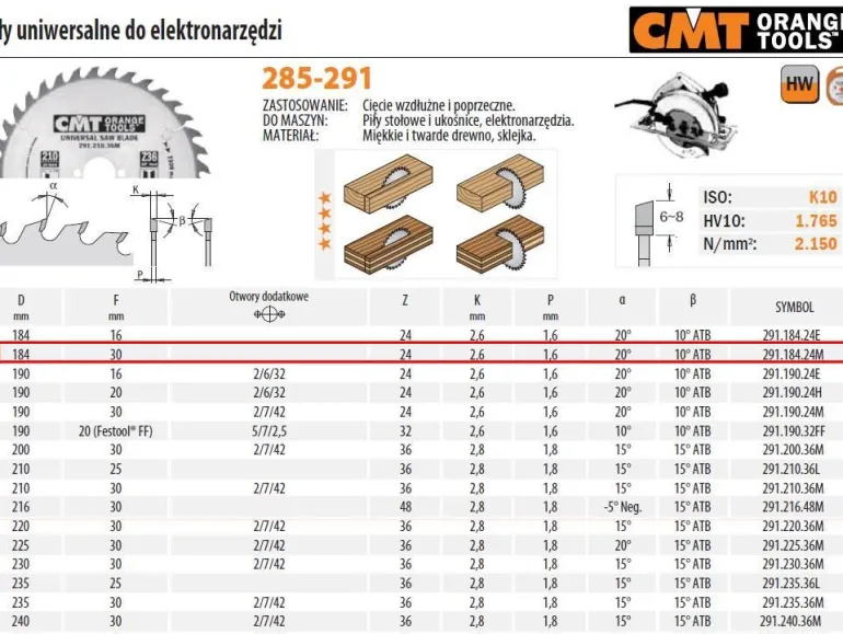 PIŁA UNIWERSALNA, DO CIĘCIA WZDŁUŻNEGO I POPRZECZNEGO HM D=184 F=30 Z=24 K=2,6/1,6