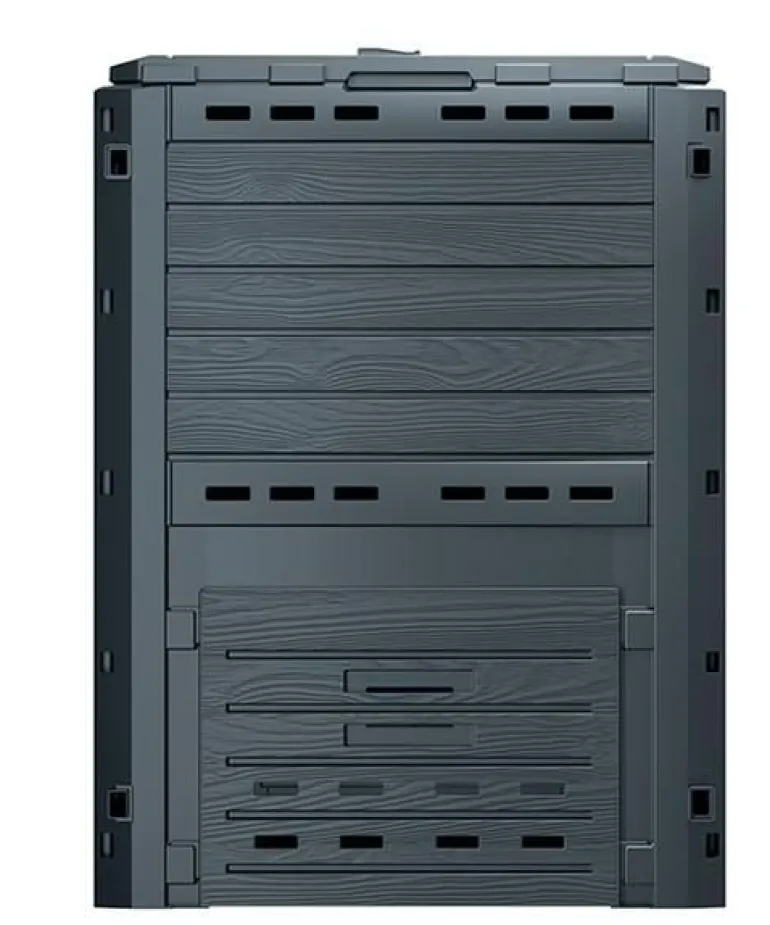 Kompostownik wyposażony jest w duży otwór do wsypywania resztek organicznych, który zamykany jest pokrywą wyposażoną w ergonomiczny uchwyt stanowiący jednocześnie zabezpieczenie przed otwarciem przez wiatr lub zwierzęta. Dolna zasuwa umożliwia wygodne wyjmowanie kompostu.