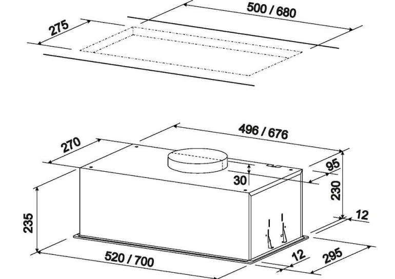Okap kuchenny do pełnej zabudowy. Występuje w dwóch rozmiarach 52 oraz 72 cm. Wykonany ze stali oraz szkła. Oświetlenie – listwa LED o mocy 6W. Możliwość pracy jako wyciąg lub pochłaniacz. Sterowany dotykowo oraz za pomocą pilota dodanego w zestawie.