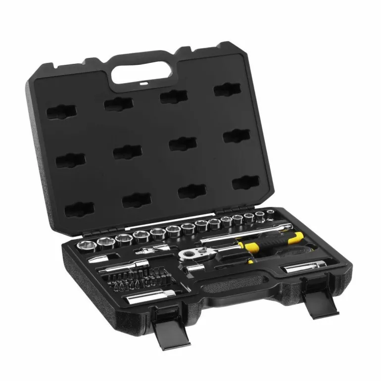 Opakowania: 1x 3/8` 72Z bi-materiałowa grzechotka14x 3/8’ nasadki (6-kątne): 8 – 10 – 11 – 12 – 13 – 14 – 15 – 16 – 17 – 18 – 19 – 20 – 21 – 22 mm2x 3/8’ przedłużki: 3” i 5”1x 3/8’ przegub uniwersalny1x 3/8’ chwyt do bitów2x 3/8’ nasadki do świec: 16 – 21 mm1x 1/4’ pokrętka1x 1/4’ chwyt do bitów22x 1/4` bity: PZ1-PZ2-PZ3 – PH1-PH2-PH3 – HEX3-4-5-6-7 – Torx10-15-20-25-27-30-40 – SLOTTED4-5-6-7