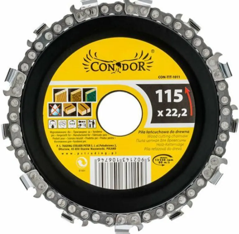 Przeznaczona do szlifierek kątowych stalowa stabilna tarcza wyposażona w naciągnięty na obwodzie łańcuch tnący.