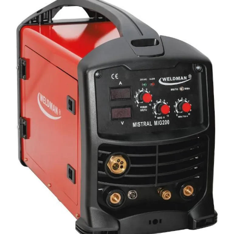 Półautomat spawalniczy zasilany jednofazowo MISTRAL MIG 200 wykonany w technologii inwertorowej IGBT do spawania metodą MIG/MAG (w osłonie gazu) lub FLUX (bez osłony gazu), do spawania metodą MMA elektrodami otulonymi prądem stałym (DC) oraz metodą TIG prądem stałym (DC) ze stykowym zajarzeniem łuku (TIG LIFT).