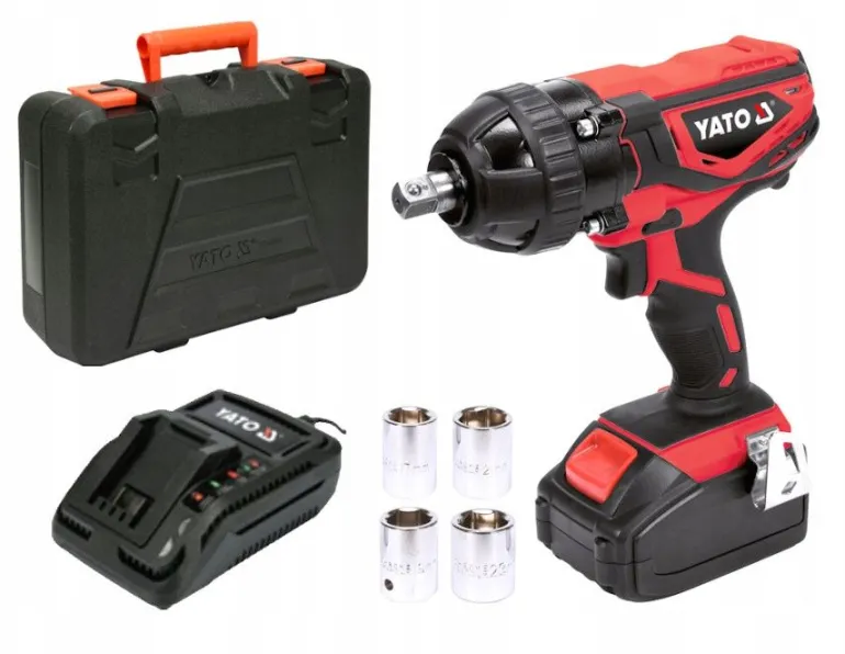 W zestawie: klucz udarowy, nasadki 17, 19, 21 i 22 mm, akumulator Li-Ion 18 V 2 Ah, szybka ładowarka (1 h dla baterii 2 Ah), walizka.