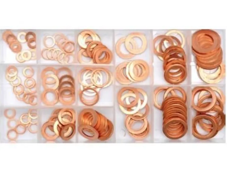 Zestaw podkładek miedzianych do zastosowań warsztatowych.