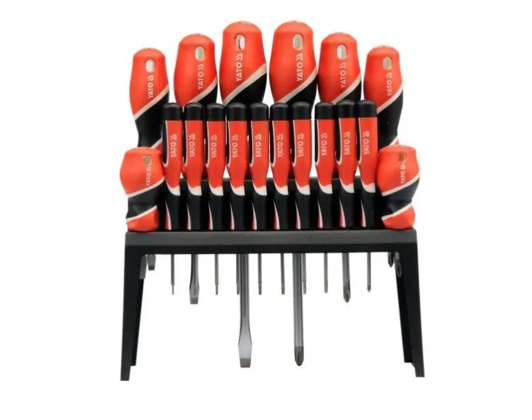 Zestaw osiemnastu profesjonalnych wkrętaków.
