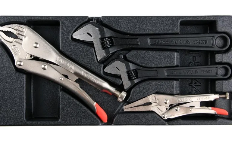 Wkład do szuflady zawierający 4-częściowy zestaw szczypiec samozaciskowych i kluczy nastawnych.