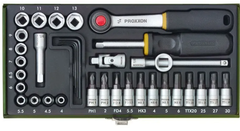 Zestaw narzędzi PROXXON 36 części dla mechaniki precyzyjnej. Z grzechotką 1/4″.