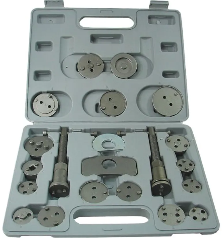 Zestaw przeznaczony do wciskania lub wkręcania tłoczków hamulcowych w zacisk hamulcowy przy naprawach pojazdów wyposażonych w hamulce tarczowe kół przednich oraz kół tylnych.