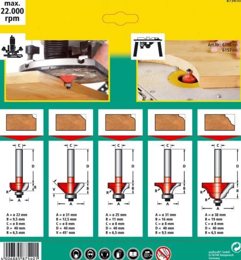 1 x frez promieniowy – pół wypukły ø 22 mm, wysokość cięcia 9,5 mm, r 6,5