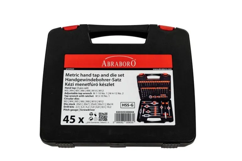Zestaw profesjonalnych gwintowników i narzynek ABRABORO wraz z akcesoriami. Niezbędny w każdym warsztacie!