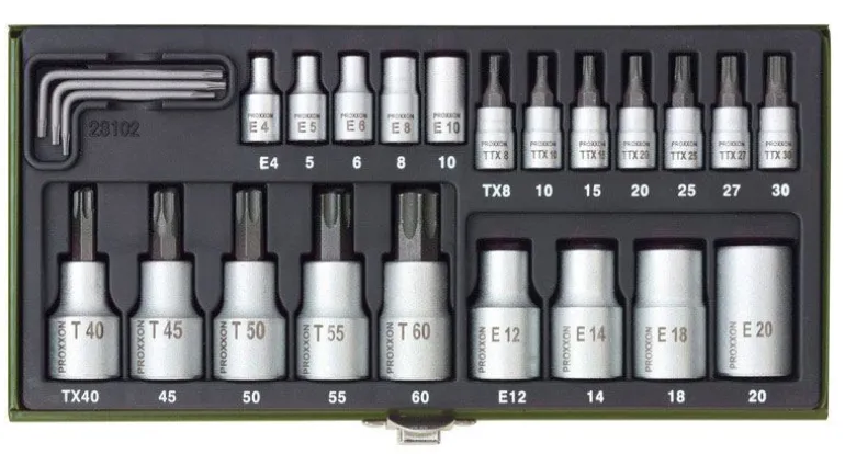 Zestaw profesjonalnych kluczy PROXXON TX –24 części. Nasadki TX dla napędu 1/4″ (6,3 mm) od TX8 do TX30 (z otworem) oraz E4 do E10 (wszystkie o dopuszczalnym nacisku 25Nm). Dla napędu 1/2″ (12,5 mm) TX 40 – 60 oraz E12 – E20 dla momentów obrotowych od 25 – 135Nm). Trzy klucze imbusowe odgięte TX 6, 8 i 10. Pozostałe elementy widoczne na zdjęciu.