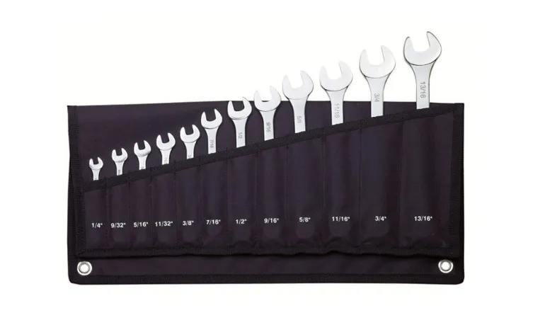 Zestaw kluczy płasko-oczkowych calowych – 12 szt. W praktycznej zwijanej rolce płóciennej i otworami do wieszania.