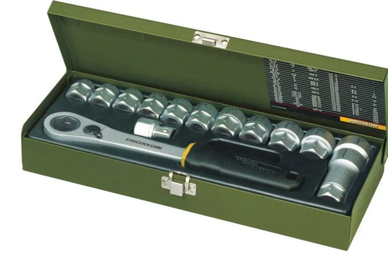 Specjalny zestaw warsztatowy PROXXON do odkręcania śrub na długich gwintach. Z nasadkami sześciokątnymi dwustronnymi i grzechotką przelotową (do prac z długimi kołkami gwintowanymi i śrubami). 14-części od 13 do 27 mm. Grzechotka z przełącznikiem. Rękojeść wykonana z TPR (thermoplastic rubber), długość całkowita 55 mm (nasadki przelotowe) oraz adapter 1/2″ (12,5 mm). Całość w stabilnej metalowej walizce, gdzie każdy element ma swoje miejsce.