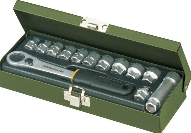 Specjalny zestaw warsztatowy PROXXON do odkręcania śrub na długich gwintach. Z nasadkami sześciokątnymi dwustronnymi i grzechotką przelotową (do prac z długimi kołkami gwintowanymi i śrubami). 13-części od 5,5 do 14 mm. Grzechotka z przełącznikiem. Rękojeść wykonana z TPR (thermoplastic rubber), długość całkowita 55 mm (nasadki przelotowe) oraz adapter 1/4″ (6,3 mm). Całość w stabilnej metalowej walizce, gdzie każdy element maswoje miejsce.