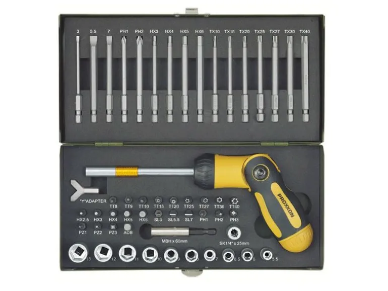 Wkrętak z ruchomym, składanym uchwytem z grzechotką + bity jakości przemysłowej, precyzyjne i odporne na zużycie. Wykonane ze specjalnego stopu stali z chromem, molibdenem, krzemem, manganem i wanadem. Hartowane wg najnowszych standardów.