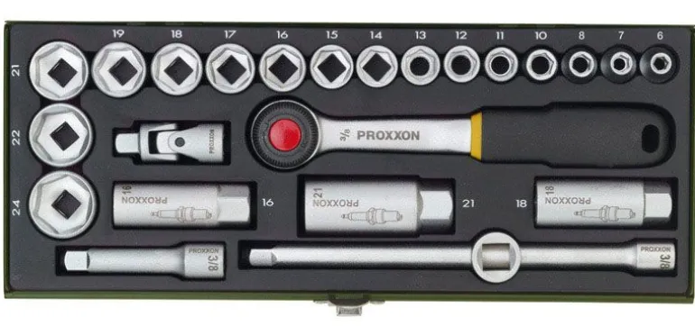 Kompaktowy zestaw profesjonalnych narzędzi PROXXON. Z grzechotką 3/8″, z nasadkami 6 – 24 mm, 24-części. Zestaw składa się z nasadek od 6 – 24 mm, nasadek do świec zapłonowych 16,18 i 21 mm. Pozostałe elementy widoczne na zdjęciu.