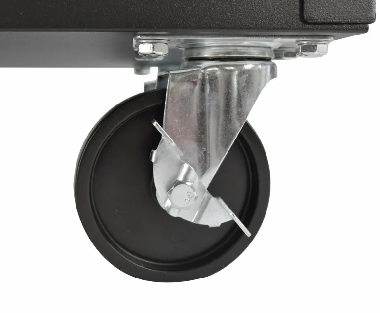 4 koła jezdne w tym 2 stałe oraz 2 skrętne łożyskowane z hamulcem.