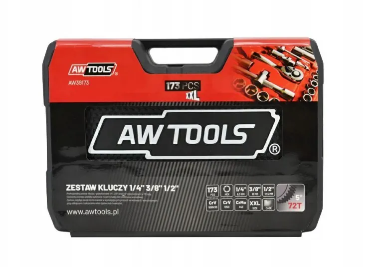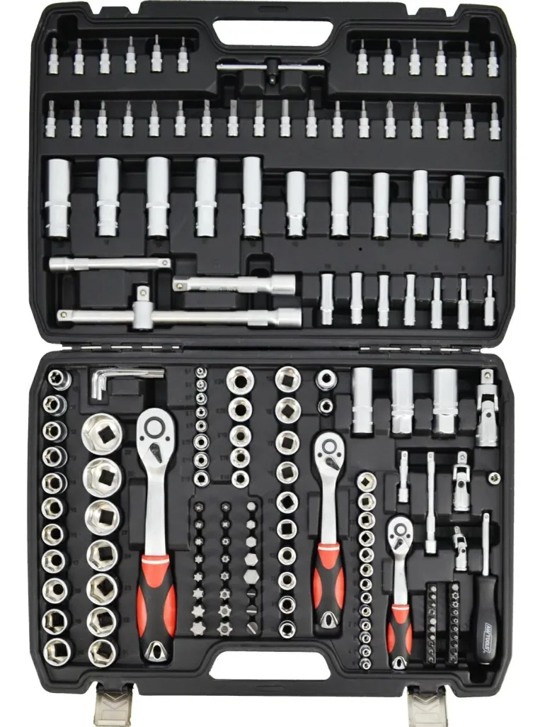 Zestaw zawiera nasadki, przedłużki, pokrętła, adaptery do bitów, klucze imbusowe, końcówki wkrętakowe i inne akcesoria.