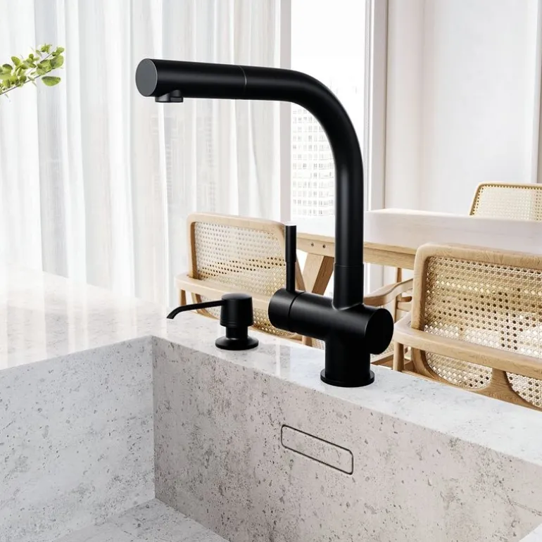 Bateria kuchenna Lobio Black zachwyca pięknym designem i funkcjonalnością. Została wykonana z dbałością o szczegóły, dlatego doskonale uzupełni kuchenną przestrzeń. Ogromną zaletą baterii jest wyciągana wylewka z solidnym mocowaniem, która pozwoli zadbać o najwyższy komfort zmywania. Elegancki, stylowy kształt i czarny kolor sprawiają, że bateria znajdzie zastosowanie zarówno w nowoczesnych, jak i klasycznych kuchniach. Zestaw zawiera: bateria, wężyki, zestaw mocujący, uszczelki.