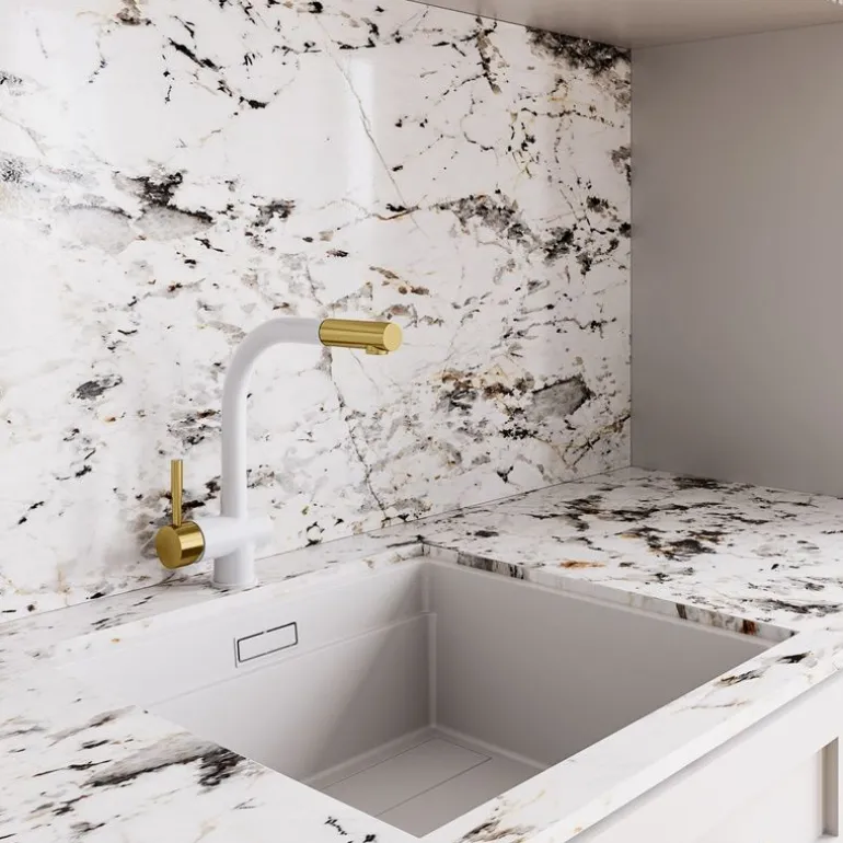 Dodaj swojej kuchni wyjątkowego blasku dzięki przemyślanym detalom baterii Lobio White/Light Gold Mat Ring. Złota końcówka wylewki nie tylko podkreśla elegancję i unikalny styl tego produktu, ale także zapewnia trwałość i odporność na codzienne użytkowanie. Uchwyt do regulacji wody, również wykończony złotą powłoką, oferuje precyzyjną kontrolę nad temperaturą i siłą strumienia, łącząc w sobie funkcjonalność z niepowtarzalnym designem. Te złote akcenty są nie tylko praktyczne, ale także stanowią wyrafinowaną ozdobę, która wyróżni Twoją kuchnię na tle innych. Wybierając baterię Lobio, decydujesz się na produkt, w którym każdy detal został zaprojektowany z myślą o zadowoleniu użytkownika i estetyce przestrzeni.