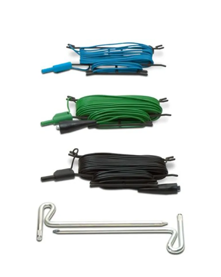 - Zestaw do pomiaru uziemienia: 2 pręty uziemiające, 3 kable testowe (2 x 20 m, 1 x 4,5 m).