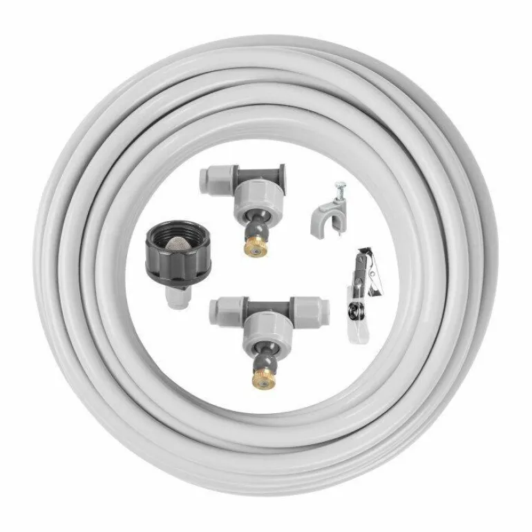 zestaw zawiera: 15 m węża, przyłącze z gwintem wew. G 3/4” – 1, dysze mgłowe – 7, dysze stop – 1, klips – 16, hak montażowy – 16