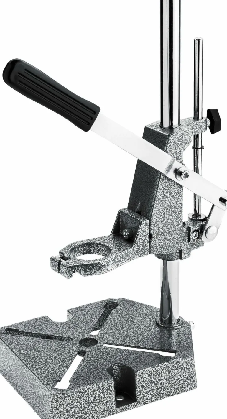 Stojak pozwala na pionową zmianę położenia zamocowanej wiertarki dzięki czemu możliwa jest stabilna praca zmniejszająca prawdopodobieństwo