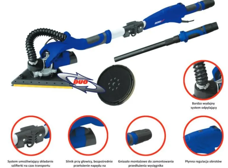 Bezpośrednie przełożenie napędu na element szlifujący, system umożliwiający składanie szlifierki na czas transportu i przechowywania.
